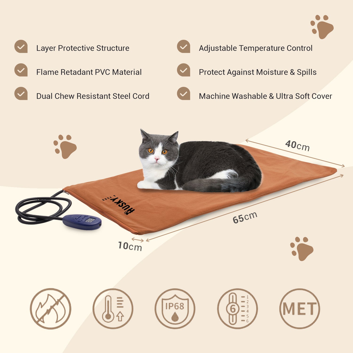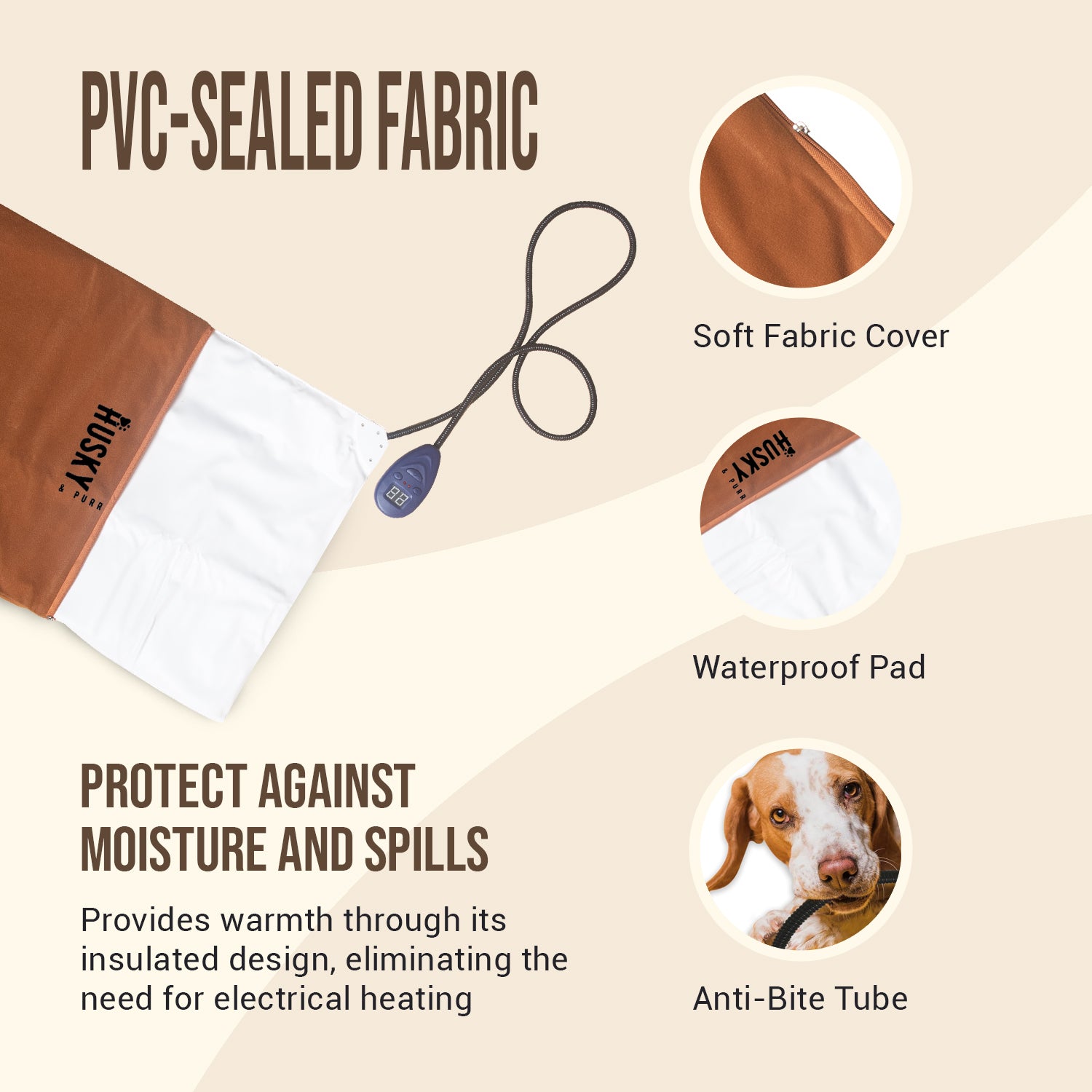 Features a bite-proof, chew-resistant power cord and automatic overheating protection. The waterproof inner layer prevents electrical hazards while ensuring complete pet safety during use.